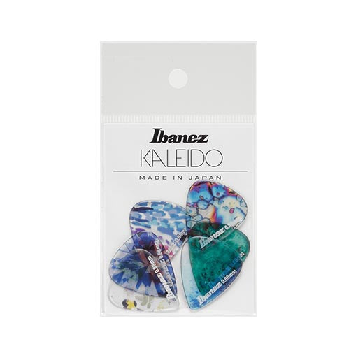 The KALEIDO series picks are made of a copolyester material called "Tritan" (“Tritan” is a trademark of the Eastman Chemical Company, Tennessee, USA). Tritan is transparent like glass, yet durable and easy to shape. Ibanez is the first company to utilize this unique material for guitar picks. KALEIDO picks have bold, colourful graphics and a milder sonic attack, allowing for effortless control of nuance and touch. KALEIDO picks are slightly softer compared to ordinary picks and are available in three different thicknesses: medium heavy, heavy and extra heavy.