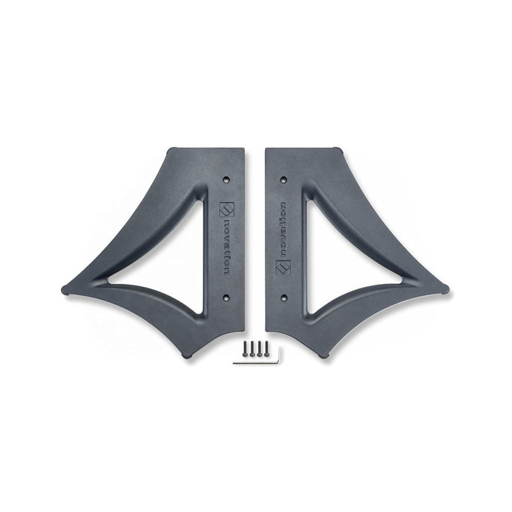 Novation's Peak Stand lifts the Peak synth off the desk (from a choice of two angles) for better placement of controller keyboards or pad controllers. The pair of stands is made of die-cast aluminium, and there are rubber feet on all the corners that come into contact with the desk. Peak Stand ships with four hex bolts, which – accompanied by the pair of stands – replace the wooden ends supplied with the Peak synth.