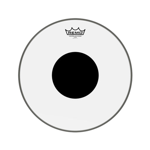 Remo's Controlled Sound Clear Top Black Dot drumheads features focused midrange tones with a well-defined attack. Made from one ply of 10 mm Clear film with a 5mm Top Black Dot, these drumheads provide articulate attack and projection with additional durability for harder hitting drummers. The drumhead's outer area offers enhanced tone and sensitivity while the center Black Dot adds durability and overtone control.